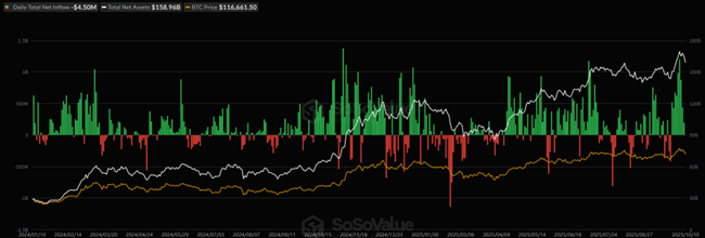 (緑・赤のバーが資金流入出 / 白線が運用資産残高合計/ 橙線がビットコイン価格)