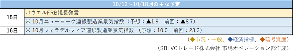 今週は米国政府のシャットダウンが解消されない限り、引き続き要人発言が市場を左右する展開が想定される。パウエルFRB議長の発言も予定されており、今後の経済見通しや金融政策方針に関するコメント次第では、円建て資産にも影響が波及する可能性がある。急落後の通常流動性を回復するまでの間は、徹底したリスク管理が求められる局面が続くだろう。