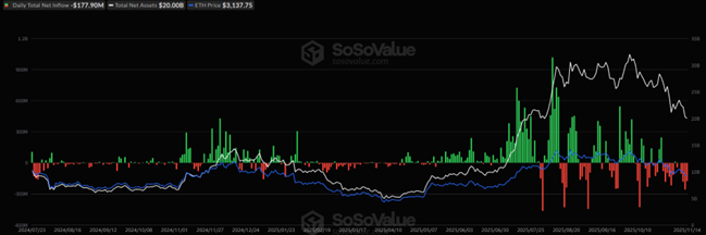 (緑・赤のバーが資金流入出 / 白線が運用資産残高合計/ 青線がイーサリアム価格)