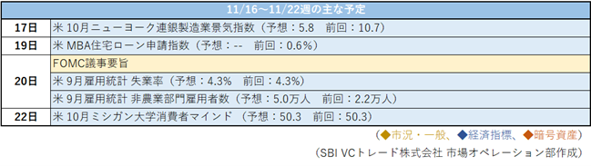 今週は米労働統計局(BLS)から9月の雇用統計が11月20日(日本時間)に発表される予定だが、政府報道官は10月の雇用統計や消費者物価指数(CPI)の発表はできない可能性があると明らかにした。先週、市場はADP週次データに敏感に反応したが普段はこのデータに市場が反応した例はほとんどない。市場がいかにデータに飢えているかがうかがえる。したがって、今週も引き続き民間のデータ発表にも余念のない確認をされたい。