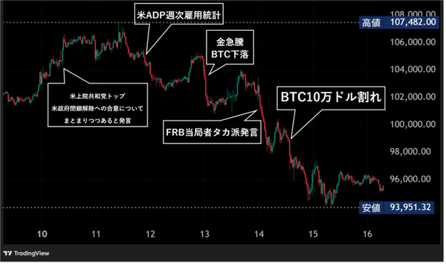11月13日(日本時間)米国のトランプ大統領は下院で可決された予算法案に署名、史上最長となった43日間の政府閉鎖に終止符を打ったことは市場にとって一時的な好材料となった。米国時間11月13日には米国初となるXRPの現物ETFがNASDAQに上場、ブルームバーグのシニアETFアナリスト、エリック・バルチュナス氏によれば、これは今年ローンチされた約900のETFの中で最大の初日取引高となるとのことで華々しいデビューを飾った。一方でリスクオンムードは長く続かなかった。米政府機関は再開したが経済データは依然として揃わず、連邦準備制度理事会(FRB)当局者の発言に注目が集まる中で利下げに対する慎重な発言が散見されたことで投資家の利下げ期待は後退している。本年の投票権を有するコリンズ米ボストン連銀総裁は政策金利を当面据え置く必要があると言及。また、労働市場の減速に言及し利下げの必要性を主張していた米ミネアポリス連銀のカシュカリ総裁も12月連邦公開市場委員会(FOMC)での政策を巡る判断はまだ保留とした。このことを受けて市場では12月利下げの確率が1カ月前の95%から49%まで低下した。さらにトランプ米大統領が食料価格高騰を抑制するため関税引き下げの意向を示したことは、「関税は物価上昇(インフレ)を招かない」と主張してきたトランプ政権にとって、事実上の方針転換とも捉えられ、関税の引き上げに伴うインフレ高止まり懸念が改めて意識されることとなった。こうした一連の発言が市場の不透明感を高め、リスク資産からの資金流出を加速させている。