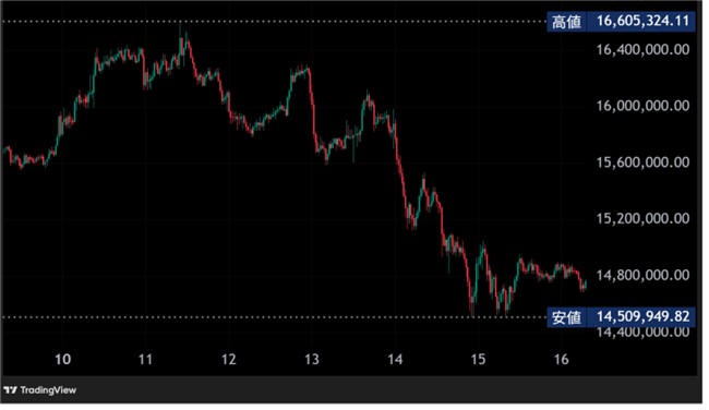 11/9~11/15週におけるBTC/JPYの週足終値は前週比▲6.04%の14,732,050円、ETH/JPYの週足終値は同▲6.49%の488,295円であった(※終値は11/15の当社現物EOD[11/16 6:59:59]レートMid値)。