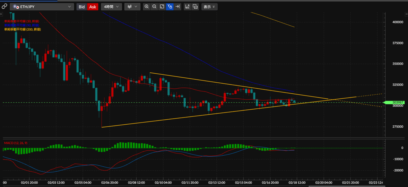 ETH/JPY 4時間足チャートの分析です。三角保合を形成中で、上限ラインとSMA90(青)が近い位置にあります。31万円前後からの戻り売りは機能しやすいと考えます。