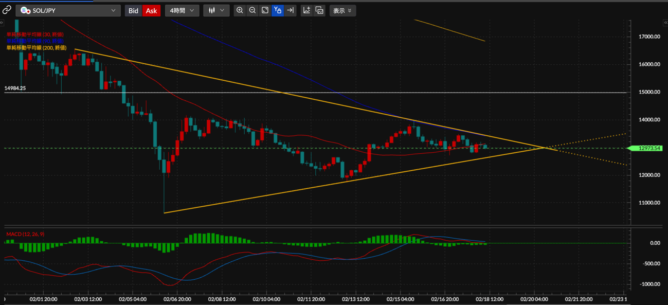 SOL/JPY 4時間足チャートの分析です。ETHと似た形状で、上値の重い展開が続いています。三角保合の上限ラインとSMA90(青)を意識し、同様に戻り売りを狙います。