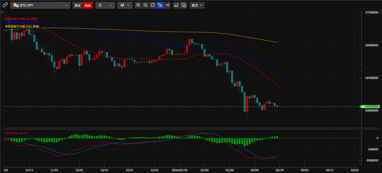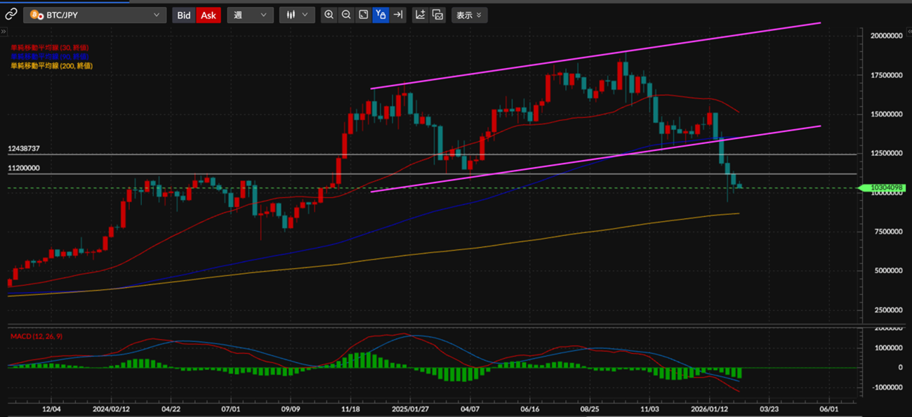 4週連続の陰線が確定し、さらに今週も陰線を形成しています。一部のアルトコインでは大幅反発が見られるものの、その後の下落幅も大きく、乱高下が続く状況です。暗号資産市場だけでなく貴金属市場も下落基調となり、資金は主要先進国の国債を中心に向かっています。現金(キャッシュ)シフトが顕著になってきたと言えるでしょう。