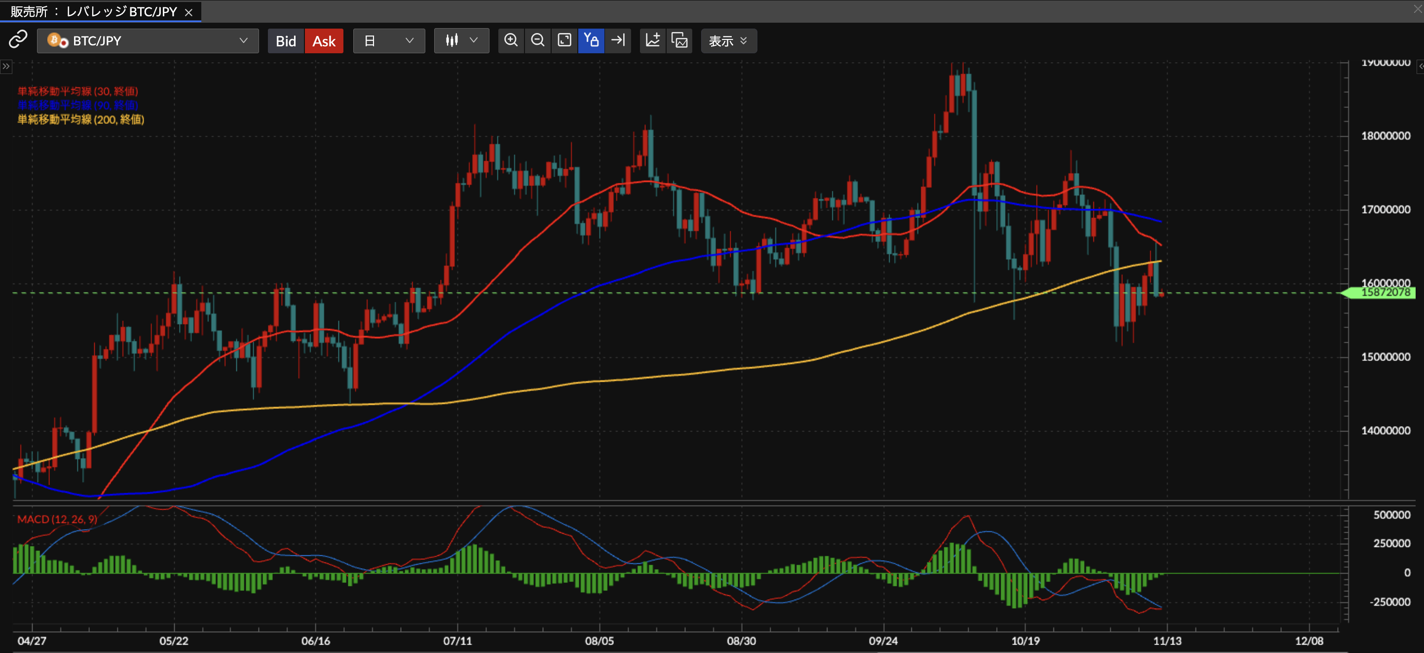 BTC/JPYの日足チャートを見ると、昨日は一時高値を更新したものの、その後大陰線を形成し、売りに押されました。残念ながらSMA200(橙)を上抜けて終値を維持することはできませんでした。