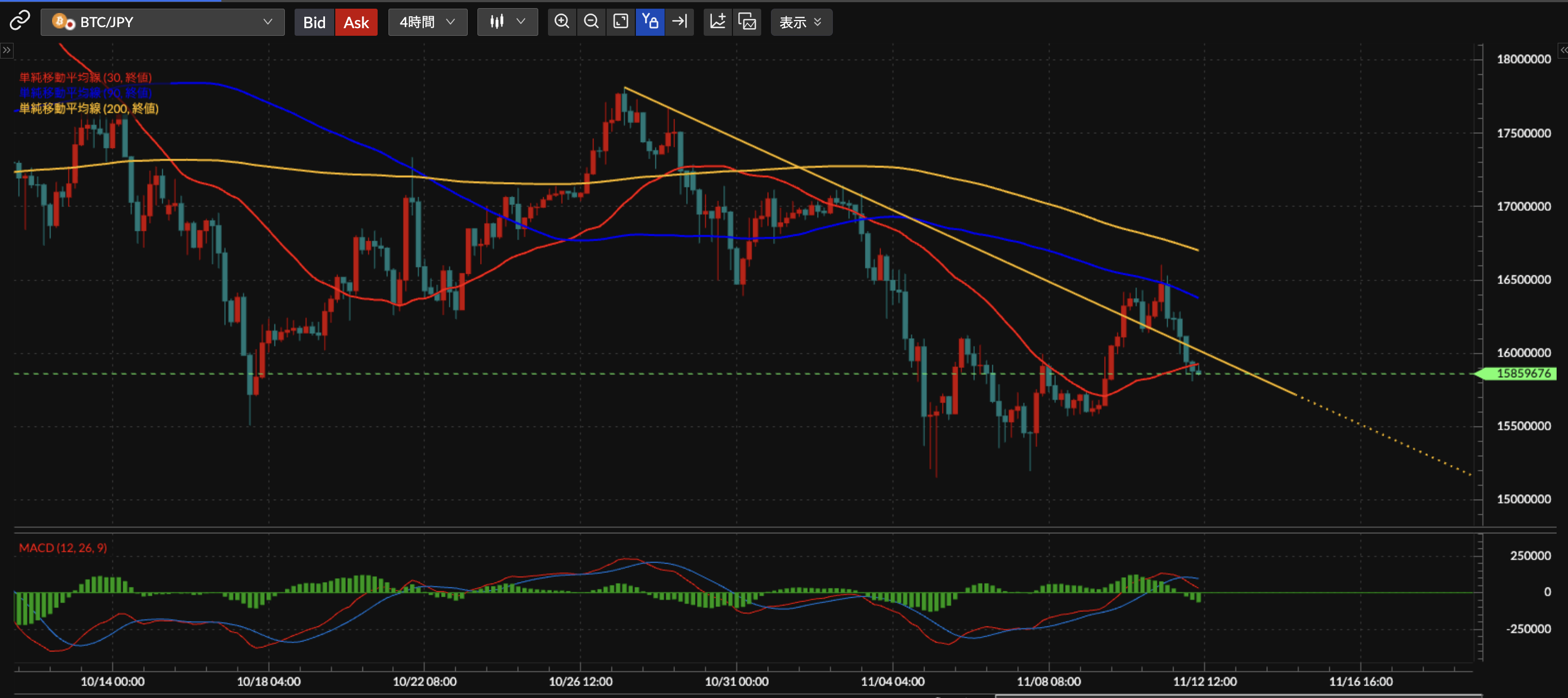 BTC/JPYの4時間足では、一時下降トレンドラインを上抜け、下落トレンド終了の兆しも見えましたが、その後再びトレンドライン内に押し戻されました。