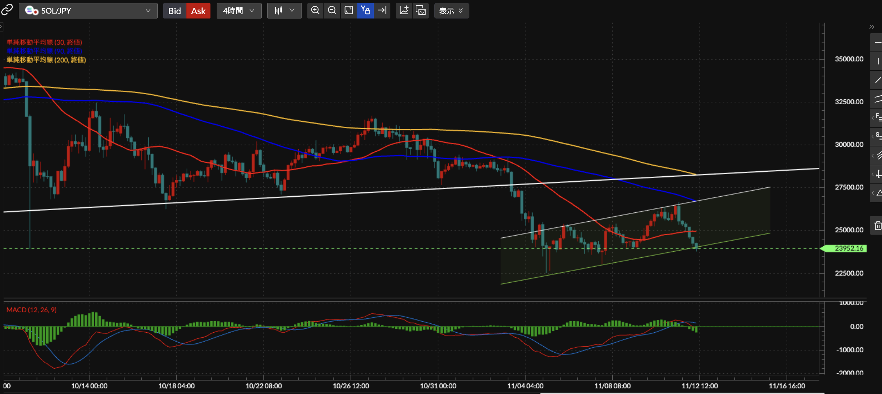 SOL/JPYの4時間足では、ETHよりもやや形状は劣りますが、依然としてボトム圏での並行チャネルを形成中です。現在は下限ライン付近に位置しており、短期的な買い場と判断しています。
