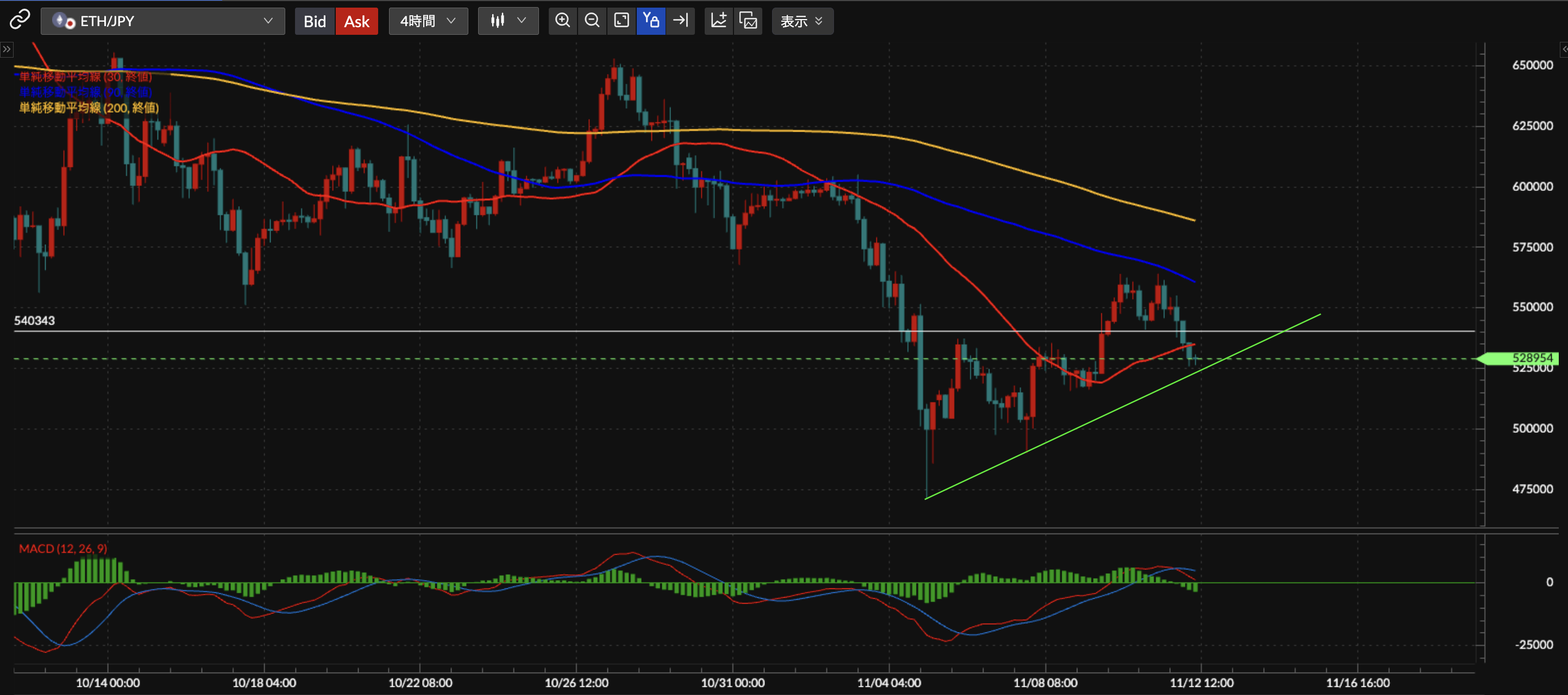 ETH/JPYの4時間足チャートでは、安値から引いた上昇トレンドラインを維持しており、反発のリズムを崩していません。