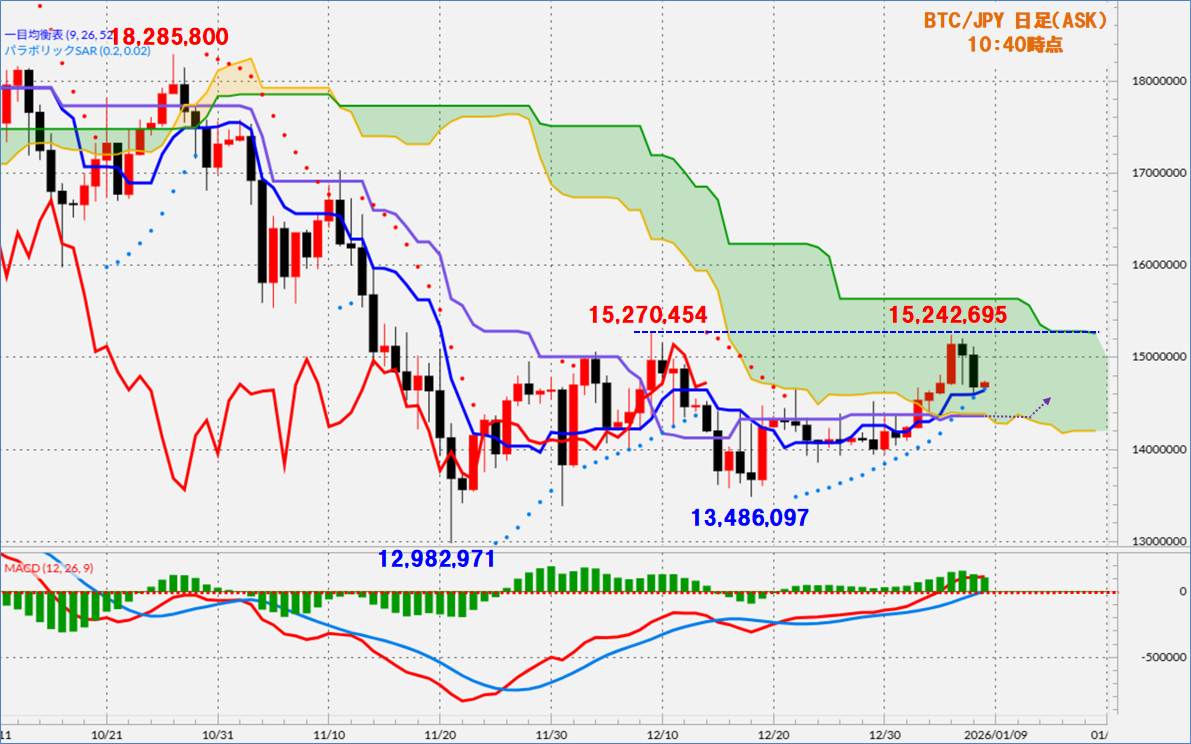 BTC/JPYは、一目均衡表の雲下限ラインを上抜けて一段の上昇となりましたが、10月からの大幅下落の戻り高値である15,270,454近辺手前で失速して上値の重い動きとなっています。ここから再び堅調な動きとなり、15,270,454や雲上限ラインを上抜けて一段の上昇となるのか、雲下限ラインを下抜けて軟調な動きとなるのか注目されています。