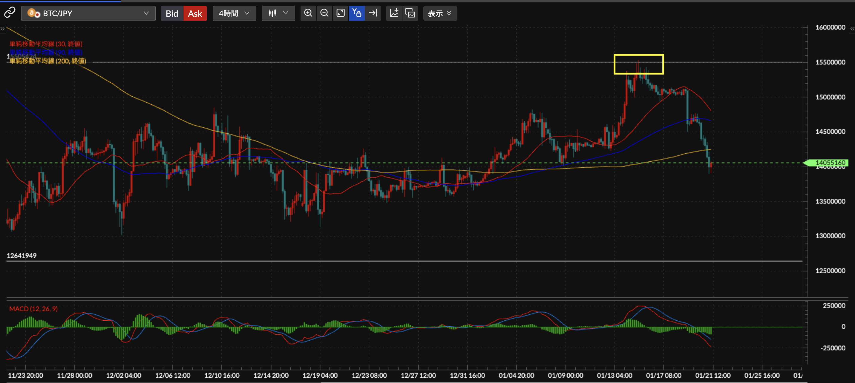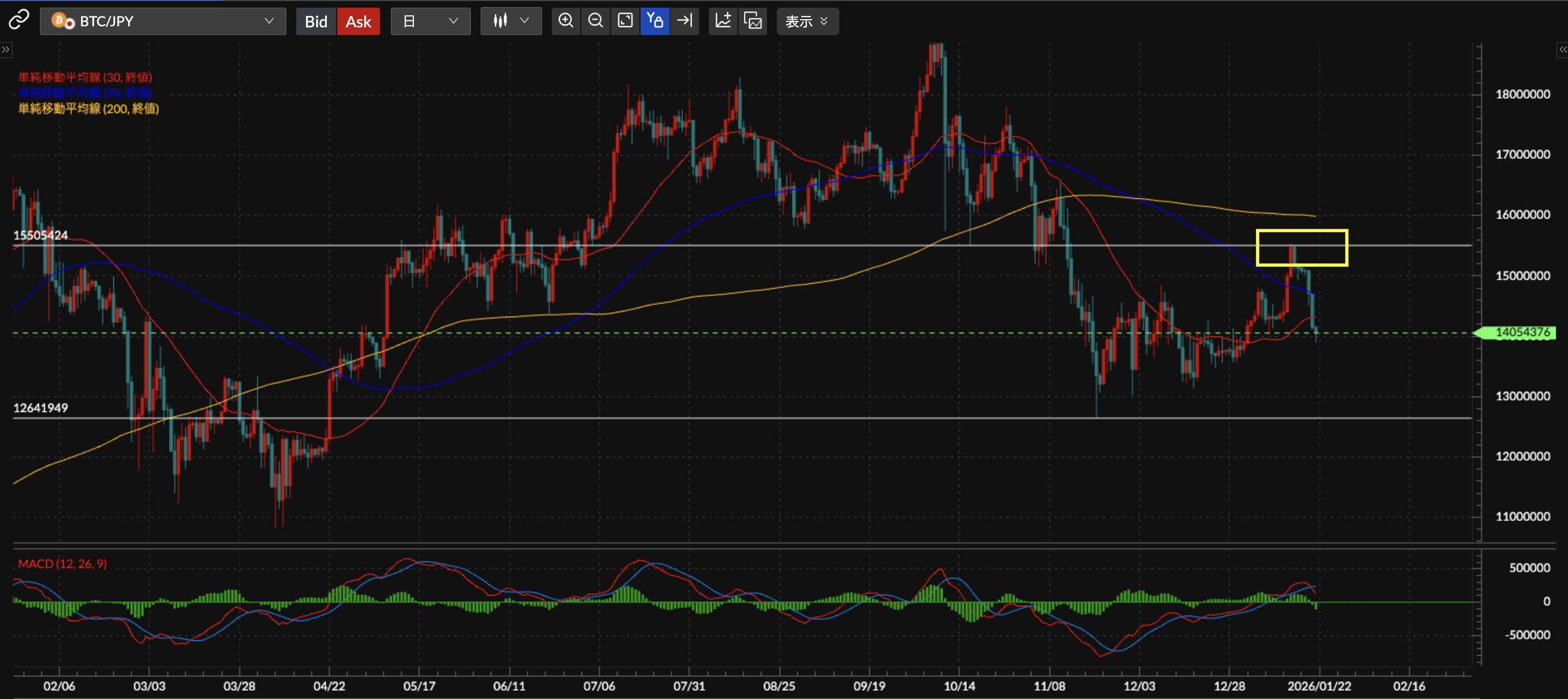 BTC/JPY日足では、1,550万円のレジサポラインが短期的なトップとなった可能性が高いです。そこから連日反落し、下げ足を早めています。目先ターゲットは1,300万円付近(12月上旬の安値圏)を想定し、売りトレードを継続したい局面です。