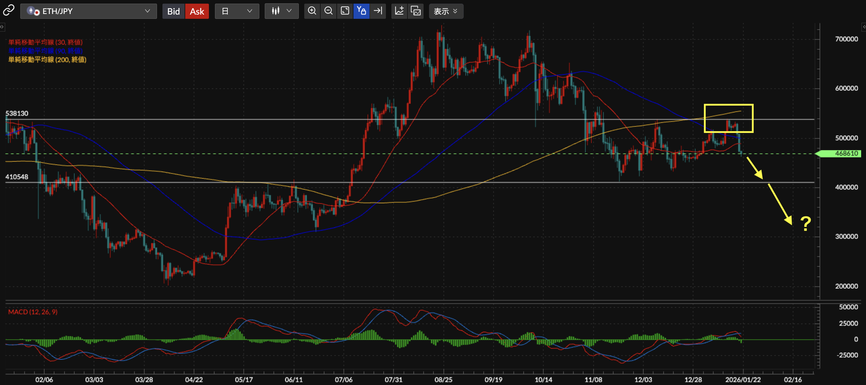 • ETHは41万円が最重要サポート。割れれば30万円も視野。