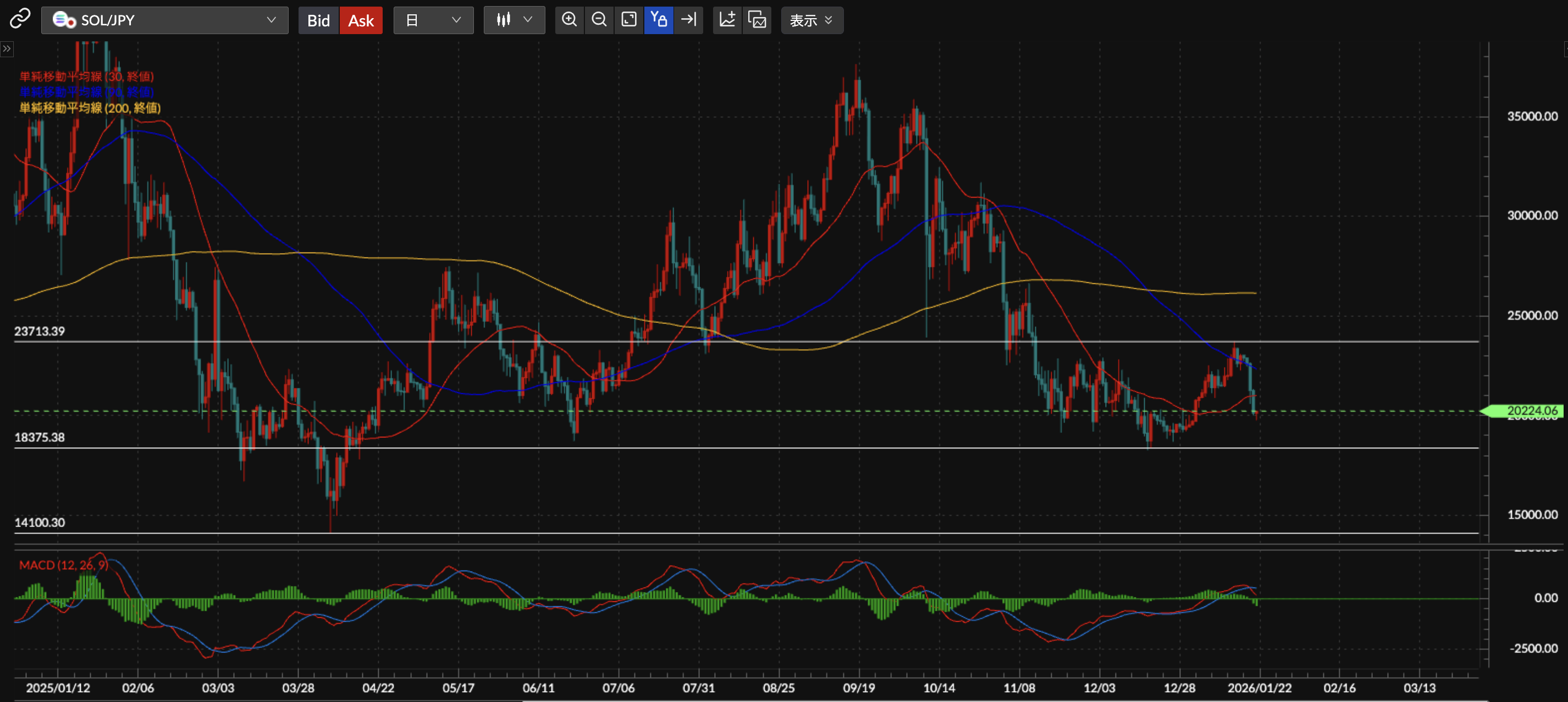 • SOLは18,400円を試し、割れれば14,300円を意識。BTCの戻り局面と同調した売りが有効。