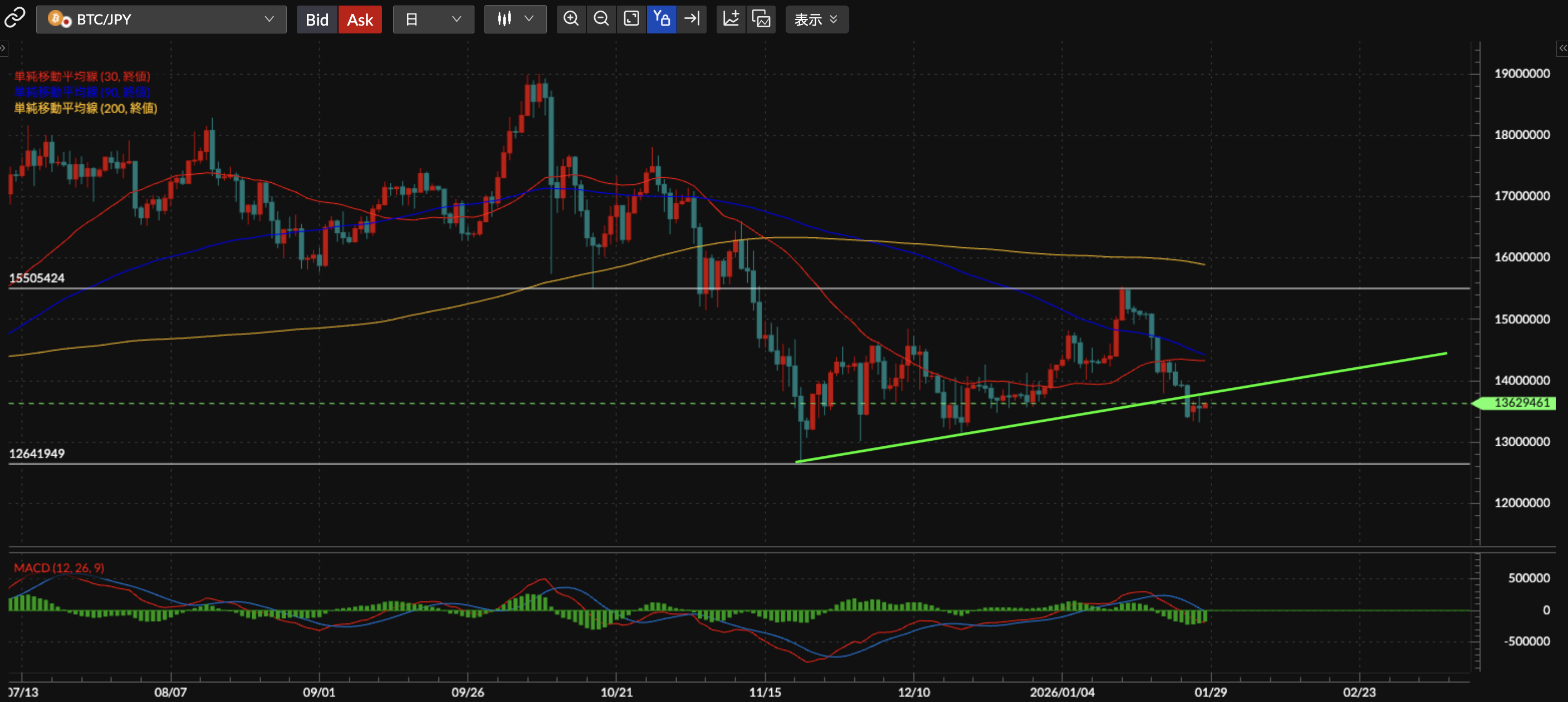 • 目先は1,420万円付近(日足SMA30付近+意識されやすい抵抗帯)が重要。突破できればSMA200方向、失速なら反落も警戒。