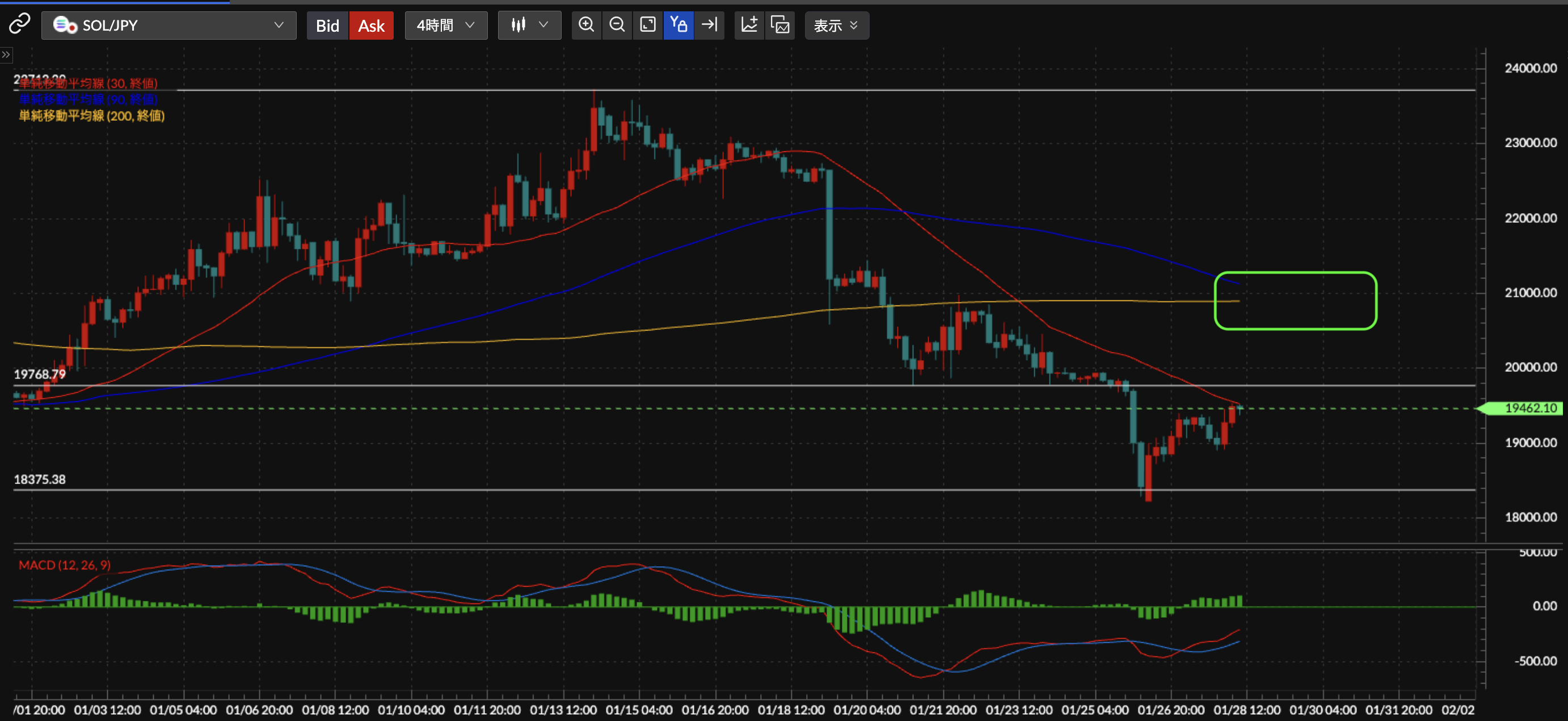 SOL/JPYの4時間足も、BTC・ETHに連れ高する展開を想定し、分析は似た形になります。まずはSMA200(橙)付近を上値目処として意識します。一方でSMA90(青)も下落してきているため、週末までにデッドクロスが近づく可能性があり、SMA90の傾き・位置関係にも注意が必要です。