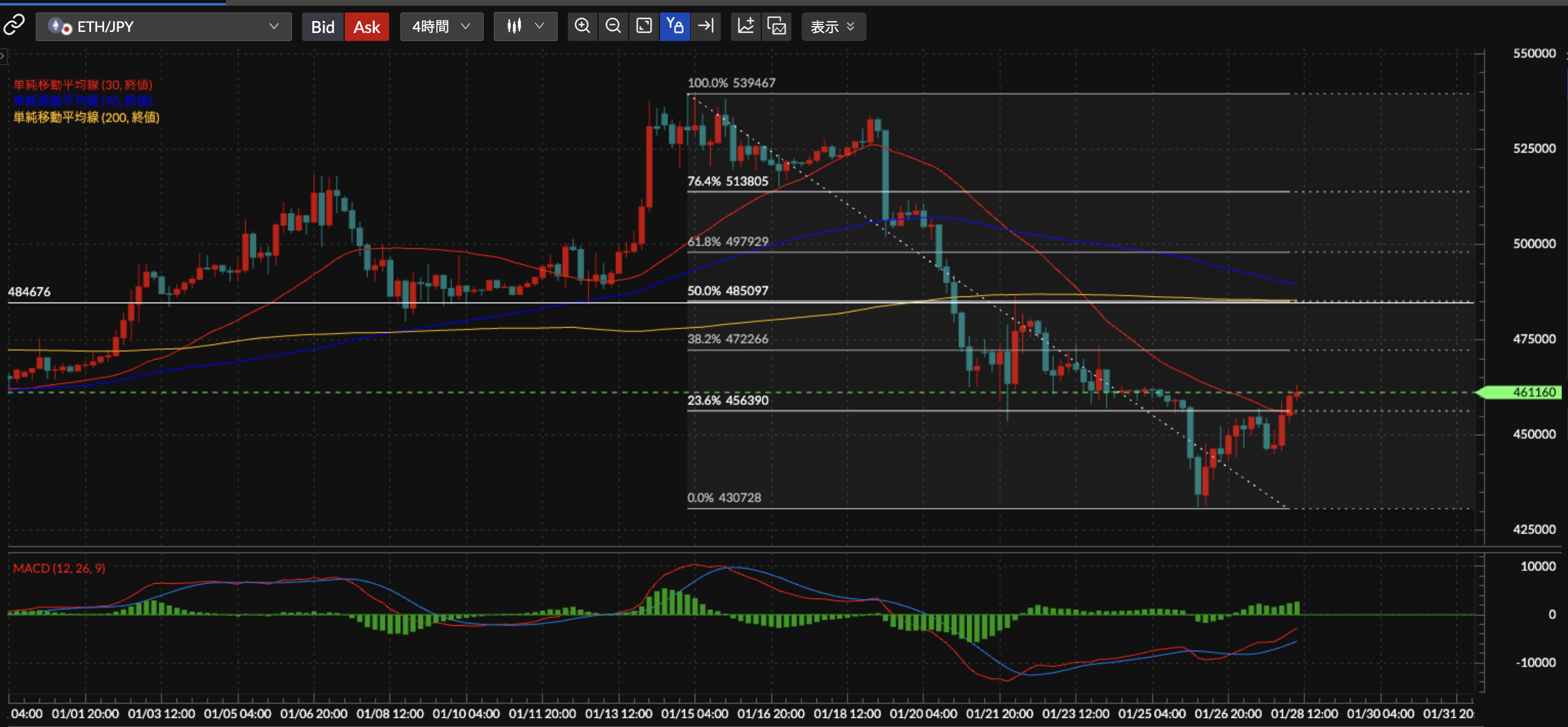 ETH/JPYの4時間足も、BTC同様に反発を期待し、買いトレード目線へ切り替えました。フィボナッチを引くと、戻りの目安は50.0%(半値戻し)の48万5,000円が意識されます。加えてSMA200(橙)も近い水準に位置しているため、上値目処として妥当と考えます。