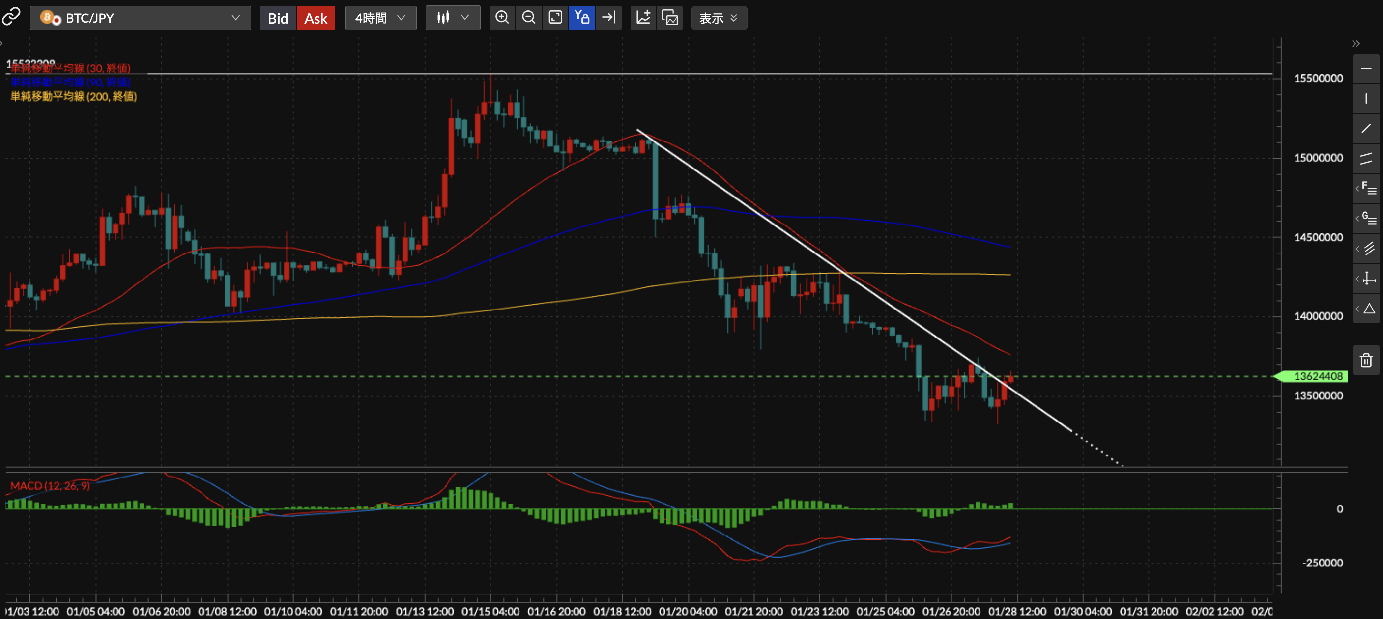 SMA30を明確に上抜ける場合、次の上値目安はSMA200(橙)です。現状、1,425〜1,430万円付近で推移しており、やや垂れてくると日足SMA30が推移する1,420万円付近と重なります。ここは重要なレジスタンスラインとして機能しやすく、いったんタッチしてから反落する展開も想定しておきます。