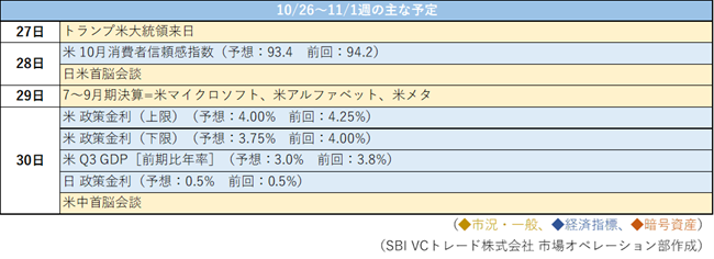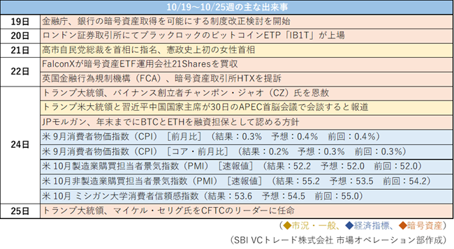 来週は暗号資産を含むグローバル金融市場全体が神経質な値動きとなる可能性がある。27日からトランプ大統領が来日し、28日には日米首脳会談、30日は日銀の政策金利決定会合に加え、米国の10月FOMCが開催される。同日にはトランプ米大統領と中国の習近平国家主席がAPECで通商協議に関する首脳会談を行う。市場の予想と異なる展開になれば、高いボラティリティが想定されるため、引き続き徹底したリスク管理が求められる。