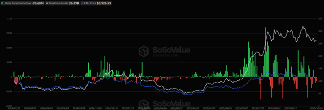 (緑・赤のバーが資金流入出 / 白線が運用資産残高合計/ 青線がイーサリアム価格)
