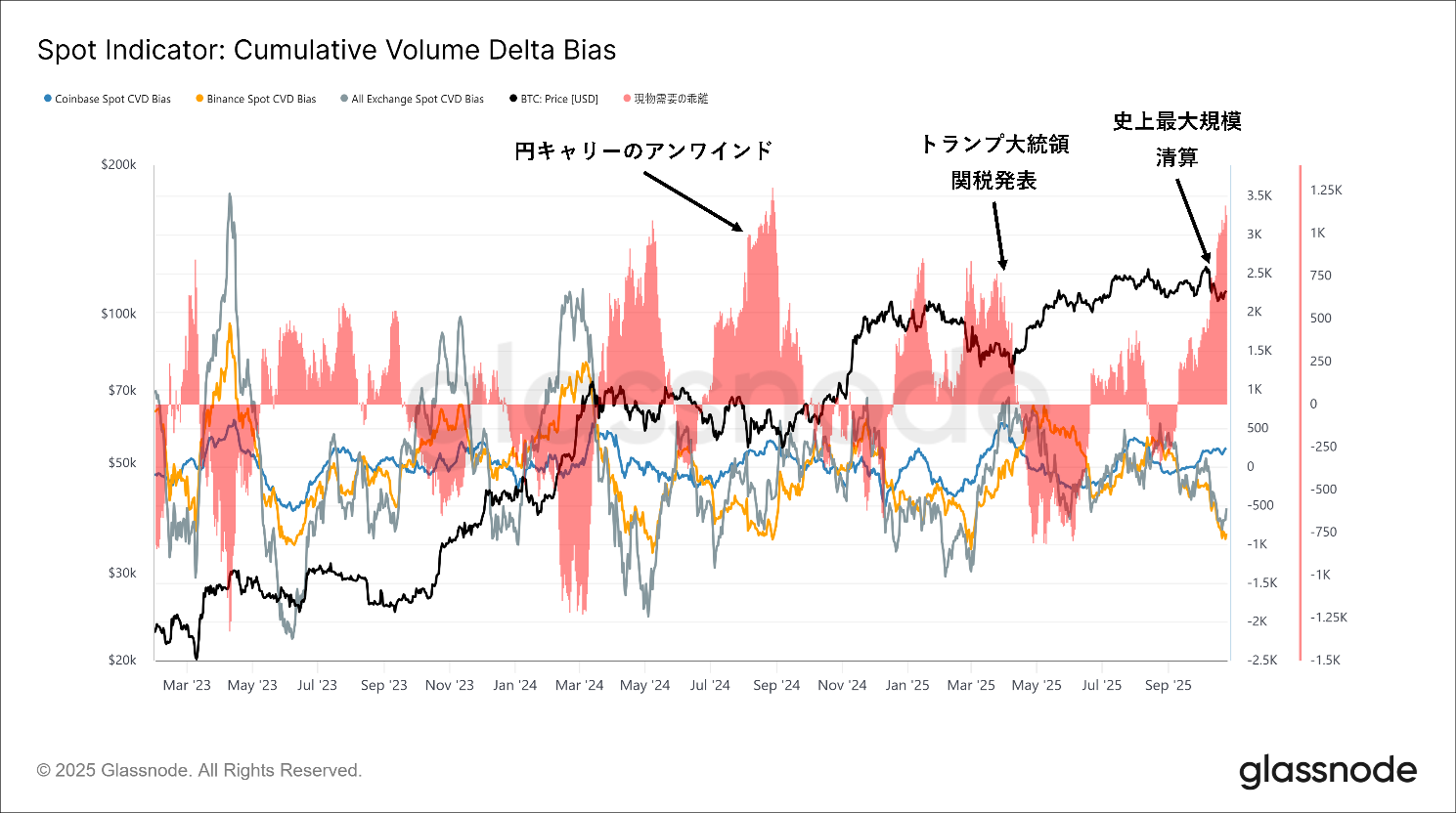 [暗号資産取引所における現物BTC累積出来高デルタの偏り(CVD Bias)の推移]