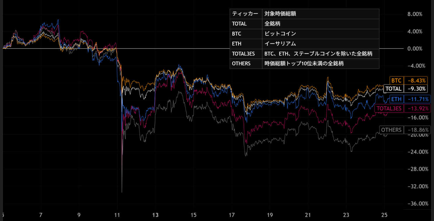 [大規模清算後の各暗号資産の時価総額推移、過去3週間]
