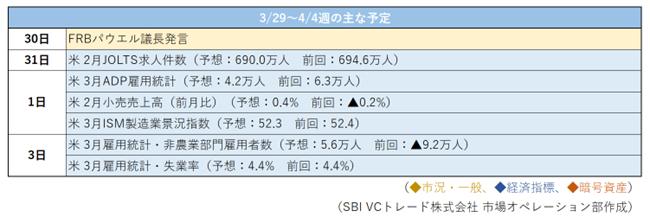 来週は米国3月雇用統計が注目経済指標となる。市場予想では非農業部門雇用者数が5.5万人~5.6万人程度の増加、失業率は4.4%と見込まれている。足元では中東情勢に伴う原油高がインフレ再燃懸念を高めており、雇用統計が予想を上回れば金利高・ドル高圧力が改めて意識されやすい。一方、停戦協議に進展が見られる場合には、直近のリスクオフの巻き戻し余地も残る。したがって、来週も暗号資産市場は固有材料よりも、中東情勢、原油価格、雇用統計、米長期金利といったマクロ要因に敏感な展開が続くものと考えられ、引き続き関連ヘッドラインのアップデートを注視したい。