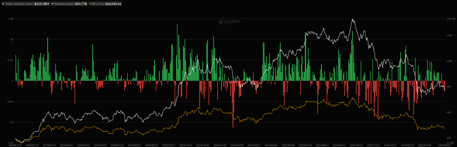 (緑・赤のバーが資金流入出 / 白線が運用資産残高合計/ 橙線がビットコイン価格)