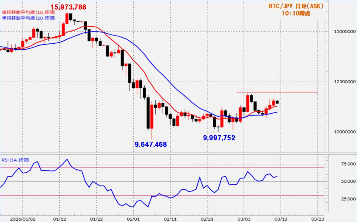 BTC/JPYでは、10日と20日の移動平均線が交差して上向きに転じたことで、価格も上昇に転じて堅調な動きとなっています。現状では、価格が両線の上側で推移しており、両線の乖離幅も拡大していることから、引き続き堅調な動きとなるのか注目されています。