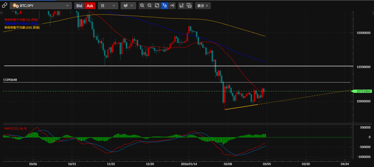 SMA200(橙)にタッチしたものの、現状は上値を抑えられている状態です。ここを明確に上抜けできれば、短期的には上昇に勢いがつく可能性がありますが、その先には1,140万円付近のレジスタンスラインが控えており、再び反落するきっかけになりやすいと考えます。