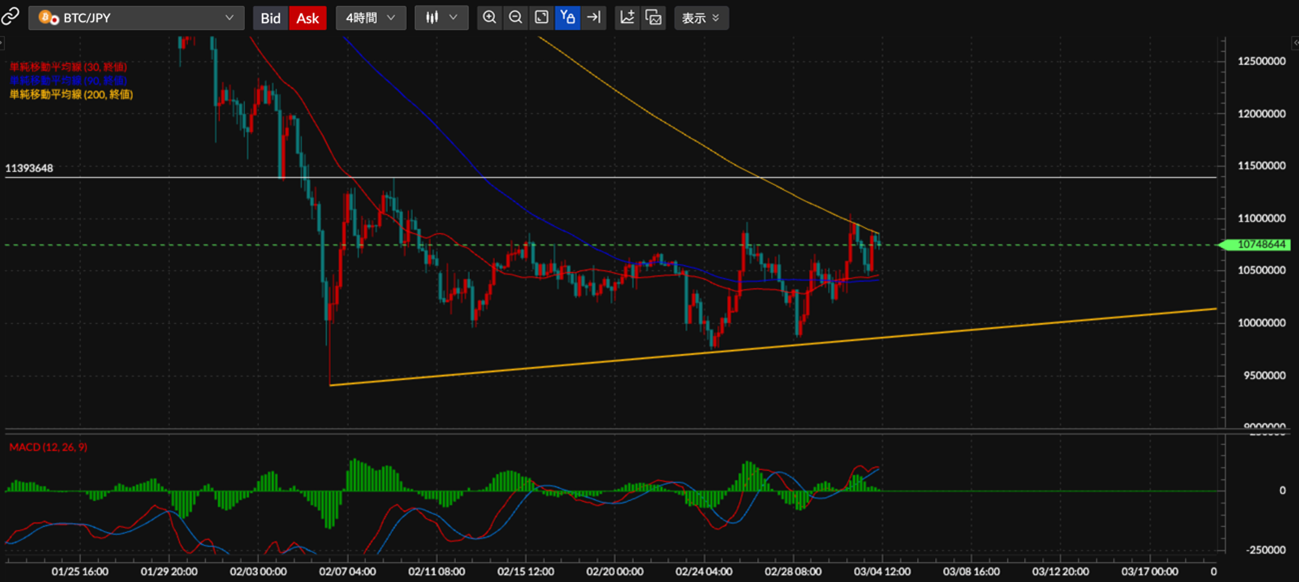 • BTCは4時間足でSMA200に上値を抑えられており、1,100万~1,150万円は戻り売りを意識する価格帯。
