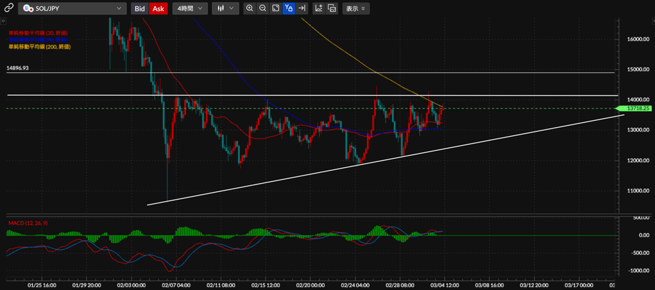 SOLはボトム圏でアセンディングトライアングルを形成しており、BTC・ETHと比較すると、相対的にやや強めのチャート形状が確認できます。
