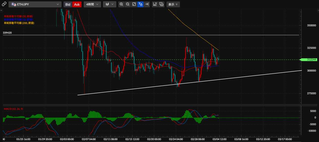 ETHについても、34万円付近のレジスタンスラインを意識しながら、戻り売りを狙いたいと考えています。BTCの4時間足と同様に、こちらもSMA200(橙)で上値を抑えられつつある状況です。