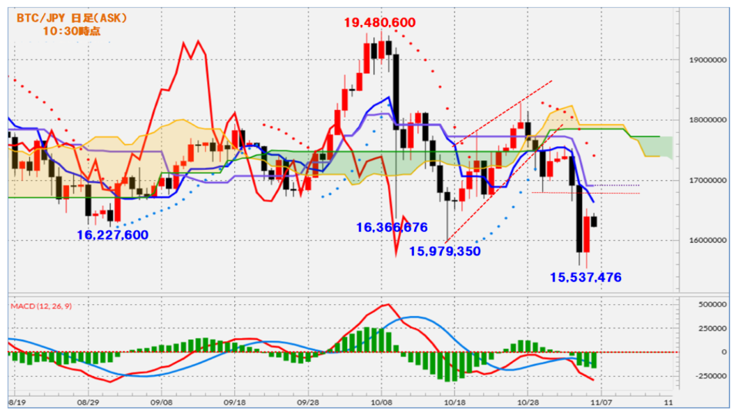 一方、下値のポイントは、直近安値の15,537,476となり、ここを下抜ける場合には一段の下げとなる可能性も考えられます。