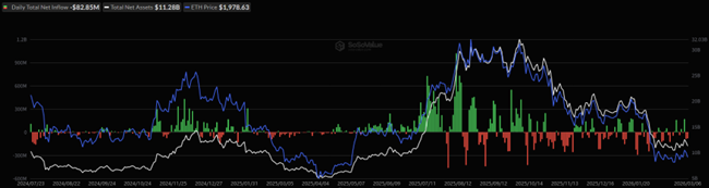 (緑・赤のバーが資金流入出 / 白線が運用資産残高合計/ 青線がイーサリアム価格)
