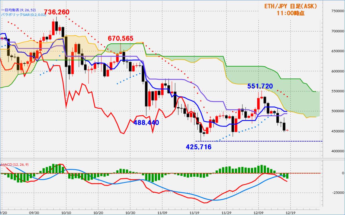一方、上値のポイントは一目均衡表の基準線、雲下限ライン近辺となり、基準線は26日まで494,050での横ばいが続きますが、27日には499,735に上昇します。ただ、26日までに436,380を下回る場合には、逆に基準線は低下となるので注目です。