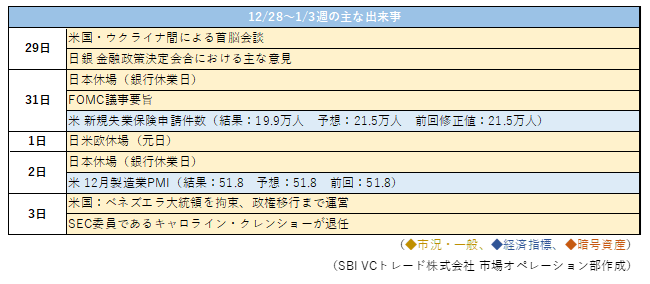 なお、米国・ウクライナ関係を巡る動きも報じられたが、年末の低流動性環境下ではリスク資産全体への波及は限定的にとどまった。