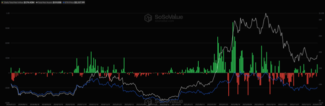 (緑・赤のバーが資金流入出 / 白線が運用資産残高合計/ 青線がイーサリアム価格)