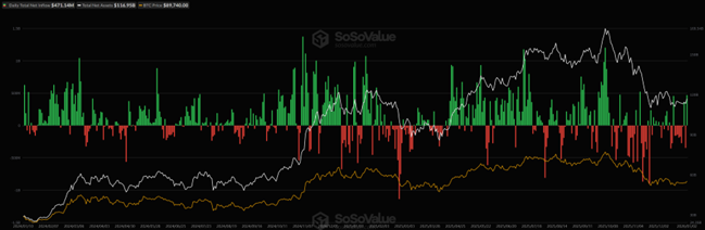(緑・赤のバーが資金流入出 / 白線が運用資産残高合計/ 橙線がビットコイン価格)