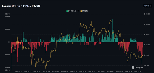 一方オンチェーンデータのCoinbaseビットコインプレミアム指数(下段の同チャートを参照)に注目すると、2025年12月中旬以降はマイナス圏で推移しており、米国投資家による積極的な追随買いは限定的であったことが窺える。一方、直近では同指数のマイナス幅が大きく縮小しており、売り圧力の後退、もしくは米国勢による段階的な押し目買いの兆しと解釈することも可能である。これは、現物ETFフローが再び純流入に転じた動きとも整合的であり、短期的なセンチメント改善を示唆している点は注目に値する。