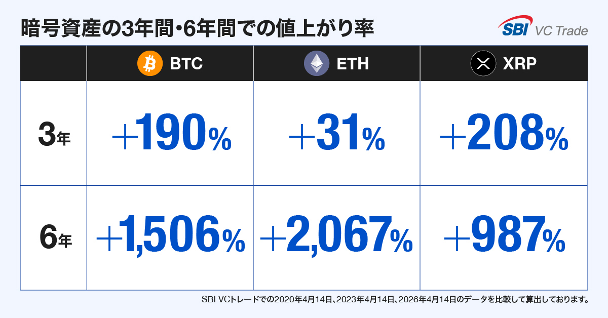 主要な暗号資産は長期では成長傾向にあり、3年間での値上がり率(2023年4月14日時点と2026年4月14日の比較)はビットコイン(BTC)で+190%、イーサリアム(ETH)で+31%、エックスアールピー(XRP)で+208%、6年間での値上がり率(2020年4月14日時点と2026年4月14日の比較)はビットコイン(BTC)で+1,506%、イーサリアム(ETH)で+2,067%、エックスアールピー(XRP)で+987%※となっております。