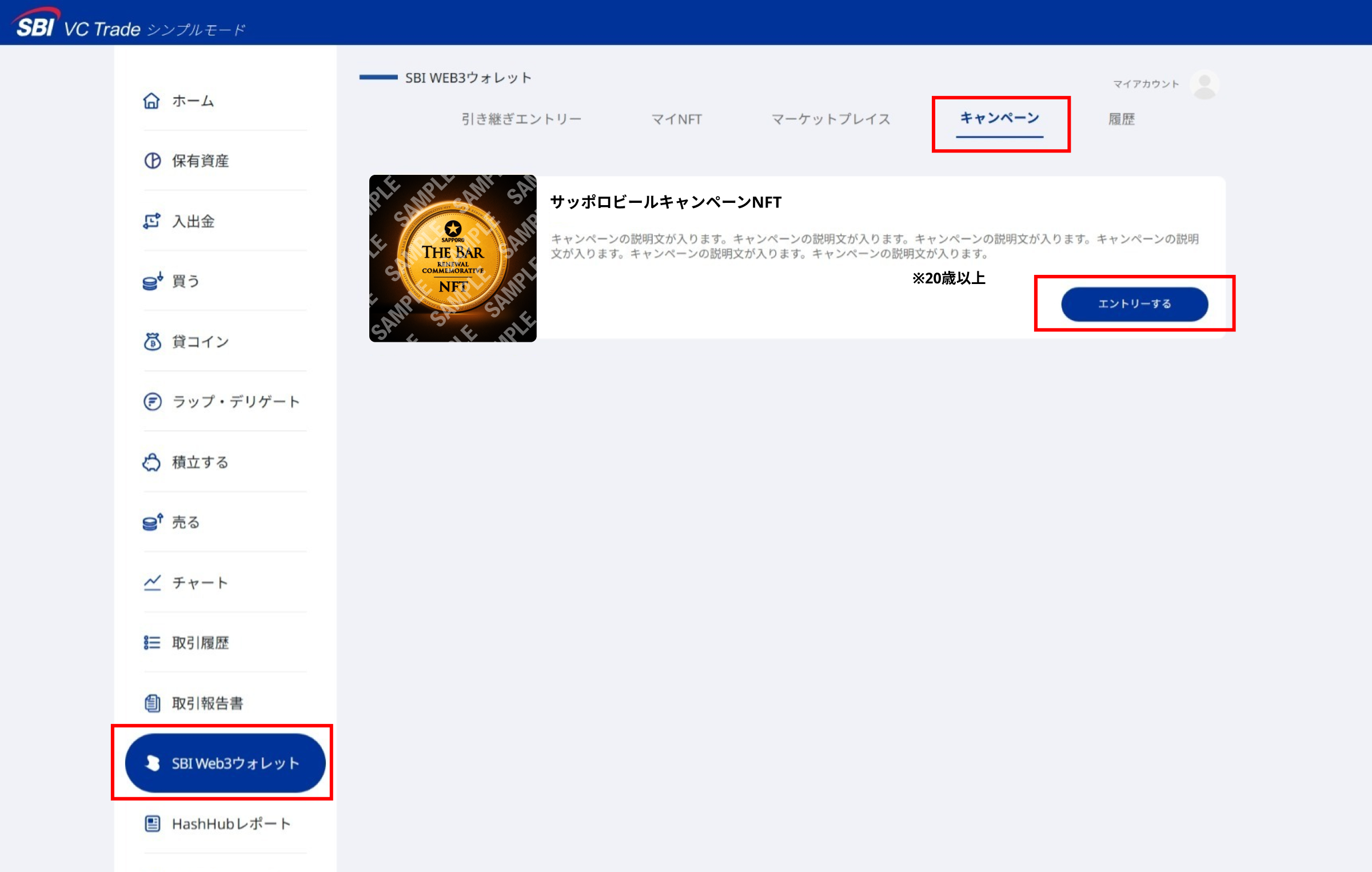 当社口座のWeb版取引ツール「シンプルモード」にログインのうえ、メニュー「SBI Web3ウォレット」から「キャンペーン」をご選択いただき、本キャンペーンの「エントリーする」ボタンを押下してください。後日、当社からNFTを配布いたします。