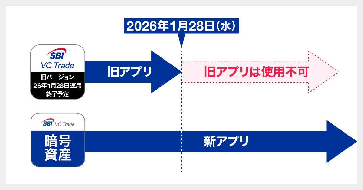 いつも当社サービスをご利用いただきありがとうございます。当社では、スマートフォンアプリ 「SBI VCTRADE mobile(旧アプリ)」を提供しておりましたが、2026年1月28日(水)をもちまして、同アプリのサービス提供を終了いたします。