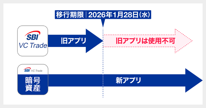 2026年1月29日(木)以降は、「SBI VCトレードアプリ(新アプリ)」へ一本化しますので、「SBI VCTRADE mobile(旧アプリ)」をご利用のお客さまは、2026年1月28日(水)までに「SBI VCトレードアプリ(新アプリ)」に切り替えを行っていただきますようお願い申し上げます。