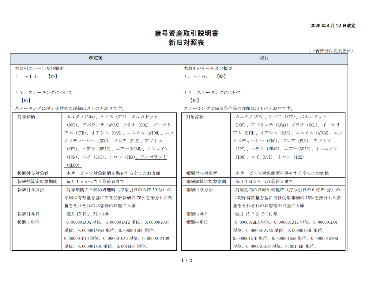 【重要】ALGO(アルゴランド)のステーキング開始に伴うVCTRADEサービス『暗号資産取引説明書』改定のお知らせ