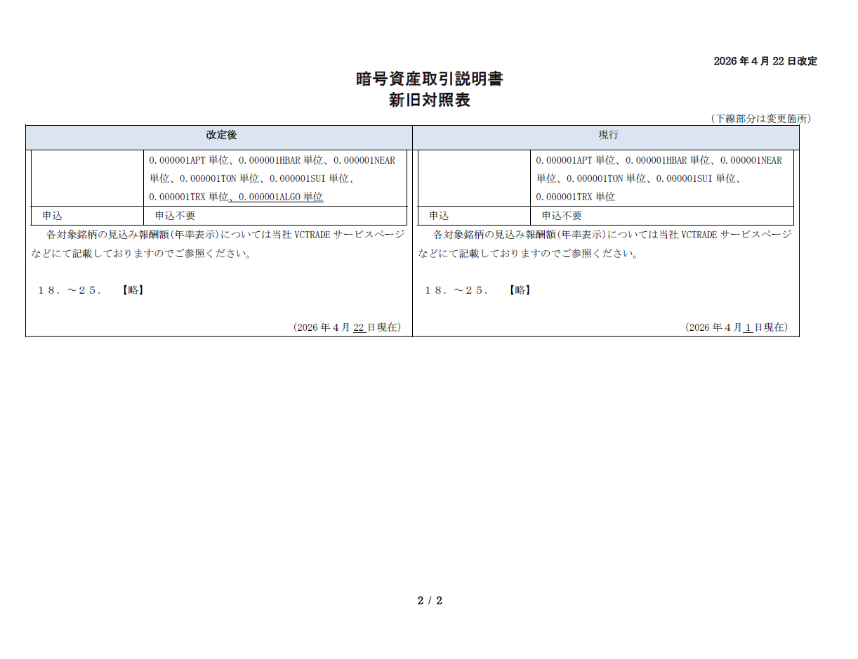 いつも当社サービスをご利用いただきありがとうございます。当社では2026年4月22日付けでVCTRADEサービス『暗号資産取引説明書』の一部を改定いたします。