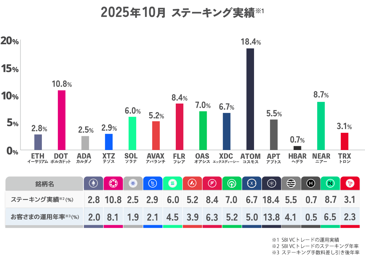 現在、SBI VCトレードでは、イーサリアム(ETH)、ポルカドット(DOT)、カルダノ(ADA)、テゾス(XTZ)、ソラナ(SOL)、アバランチ(AVAX)、オアシス(OAS)、エックスディーシー(XDC)、コスモス(ATOM)、フレア(FLR)、アプトス(APT)、ヘデラ(HBAR)、ニアー(NEAR)、トロン(TRX)のステーキングサービスを提供しています。