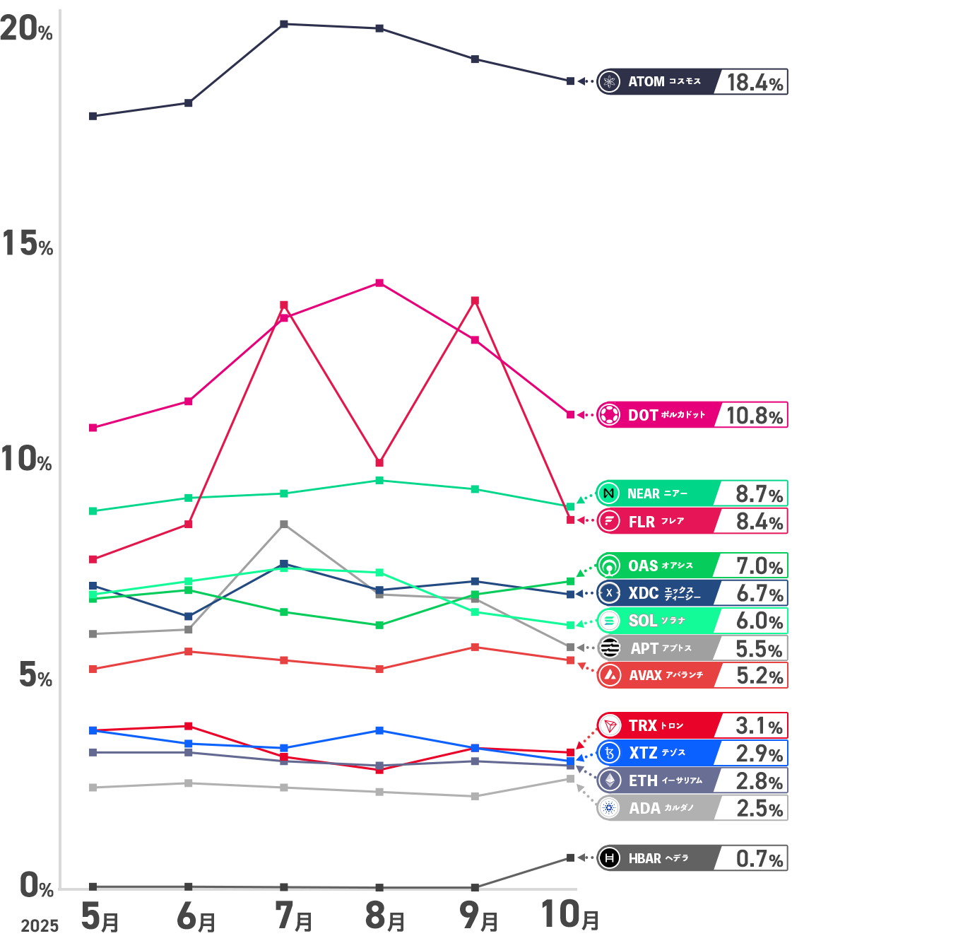 イーサリアム(ETH)、ポルカドット(DOT)、カルダノ(ADA)、テゾス(XTZ)、ソラナ(SOL)、アバランチ(AVAX)、オアシス(OAS)、エックスディーシー(XDC)、コスモス(ATOM)、フレア(FLR)、アプトス(APT)、ヘデラ(HBAR)、ニアー(NEAR)、トロン(TRX)です。